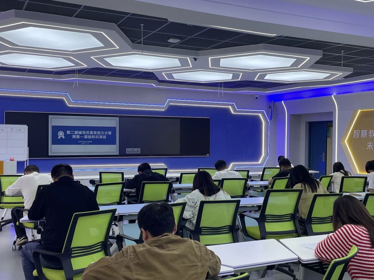 这一环节采取闭卷作答方式进行,着重考察辅导员的理论素养和业务知识。参赛辅导员们仔细阅题,沉着思考,认真作答。