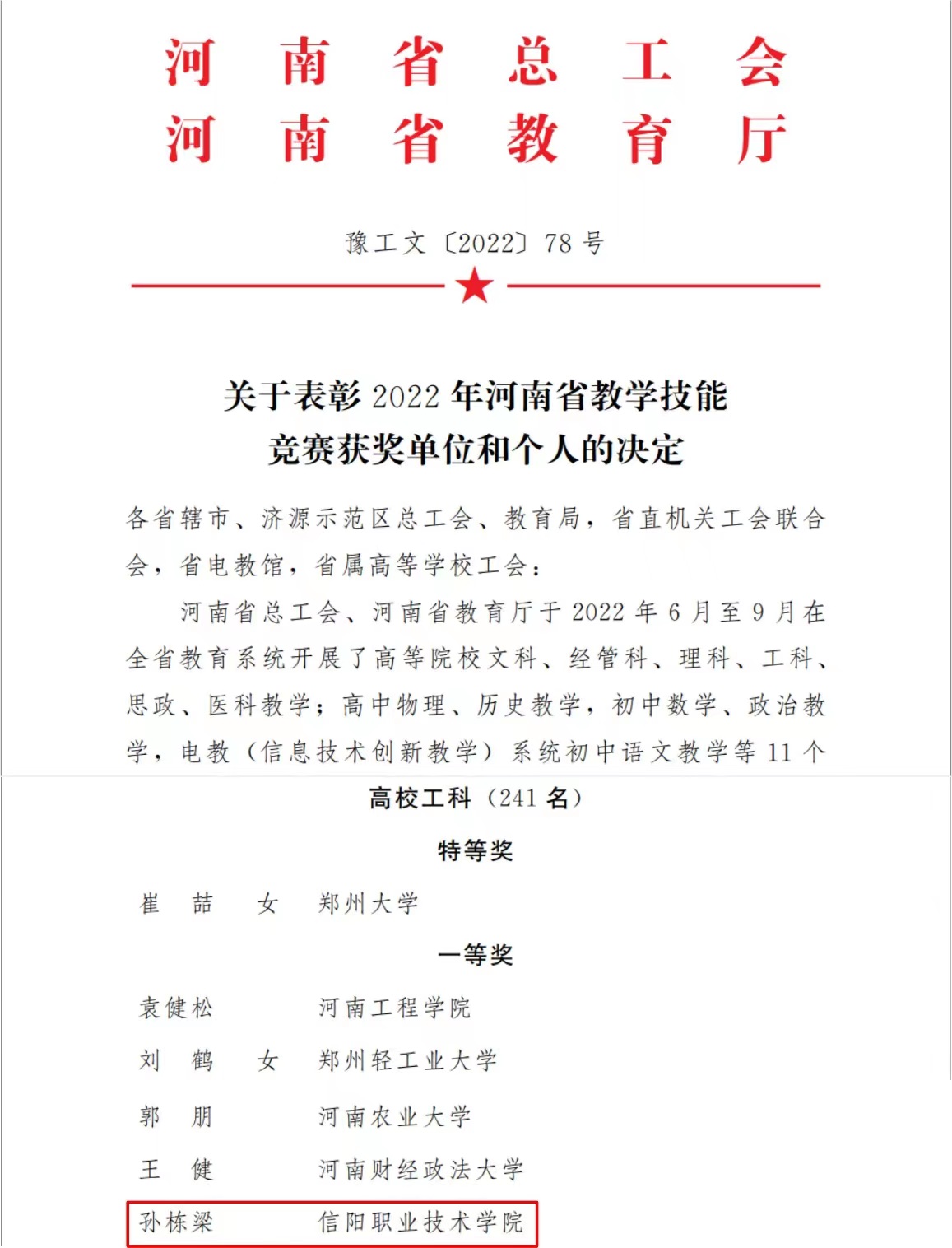 2022年9月16日,由河南省总工会、河南省教育厅主办,河南省教科文卫体工会以及洛阳理工学院承办的河南省教育系统2022年度教学技能竞赛(现场决赛)落下帷幕。信阳职业技术学院九游(JIUYOU.COM)娱乐第一门户教师孙栋梁进入决赛,荣获高校工科组一等奖,被授予“河南省优秀教学标兵”荣誉称号。
