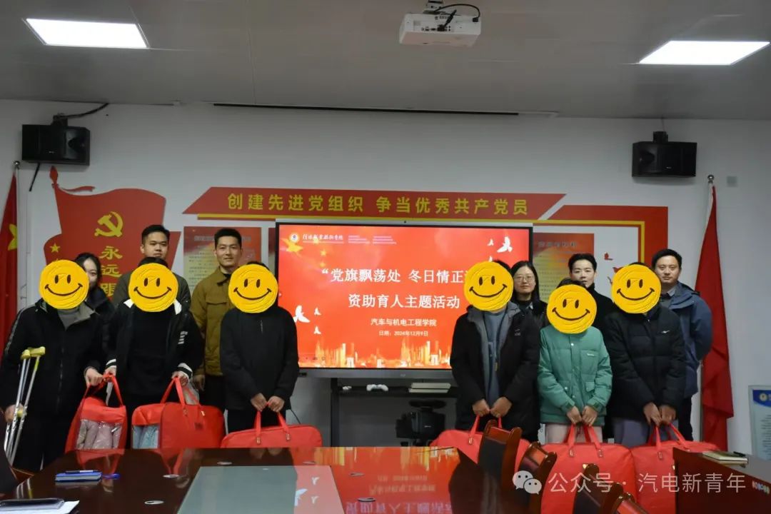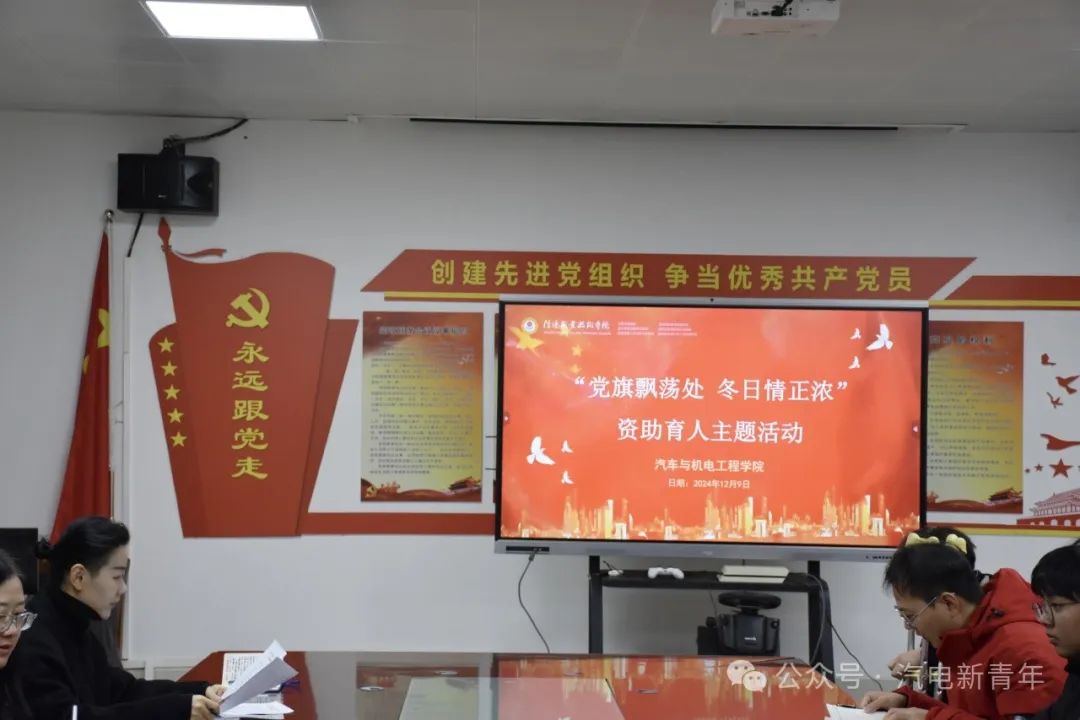 12 月 9 日上午十点,汽电学院开展了 “党旗飘荡处,冬日情正浓” 资助育人主题活动。党总支书记朱燕鸣、党总支副书记兼学工支部书记张礼涛、副院长曾勇、团总支书记李明、学工办主任周武郁以及各位辅导员和受助学生参加了本次活动,活动由副院长曾勇主持。