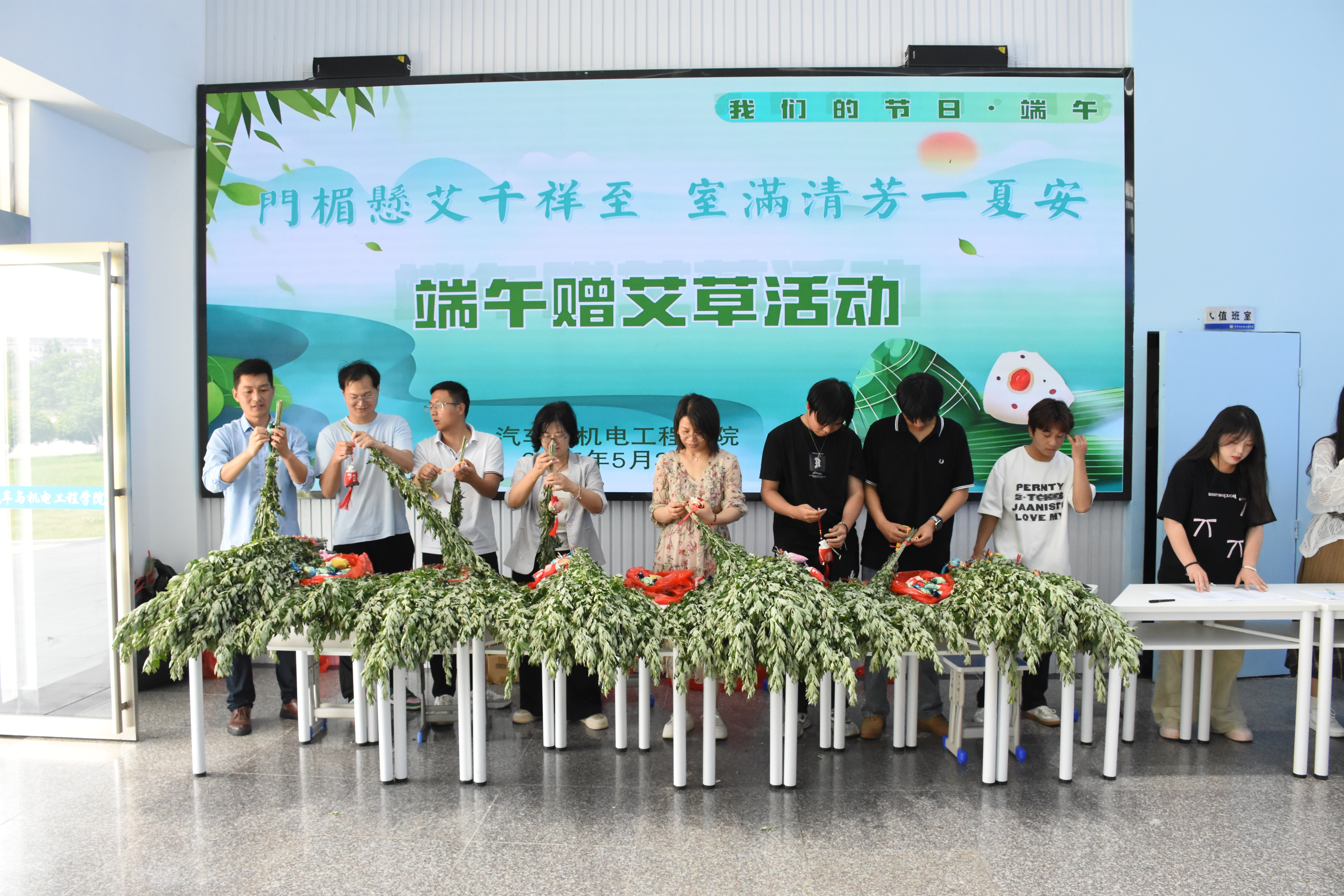 正午时分,学院大厅,青衿汇聚。导员素手轻分,将青翠与芬芳递至学子掌心。殷殷寄语,随艾香流淌。纤指轻系,艾草垂门,缕缕清芬,是无声的守护,伴你书山攀登,学海徜徉。